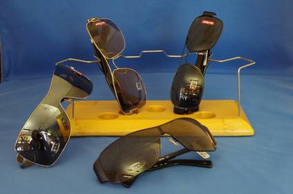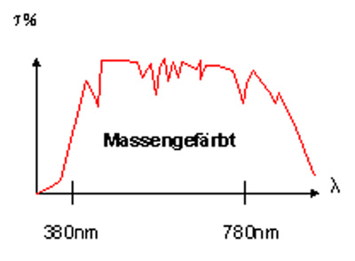 Die Ausführungsformen bzw. Herstellungsarten von Sonnenschutzgläsern entsprechen denen der Filtergläser. Zu den schon genannten Vorteilen der UV-A Absorption kommt hier eine Reduktion des sichtbaren Lichts in verschiedenen Stufen hinzu (Blendung vermindern). Die häufigsten Reduktionen sind 65 bis 75% Absorption. Gemessen wird die Reduktion bei 555nm für ein 2mm dickes Glas mit der Normlichtart D65.